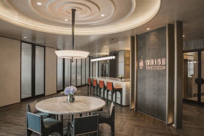 宽敞的接待休息室装饰着雅致的人字形图案地板、纹理漆墙和天花板,以及作为隔板的优雅木鳍片,展示了对细节的一丝不苟。以公司品牌图案为灵感的迷人壁纸热烈欢迎客人的到来。在保持总体主题的同时,空间内的每个房间都拥有独特的视觉形象。#办公室设计装修#
