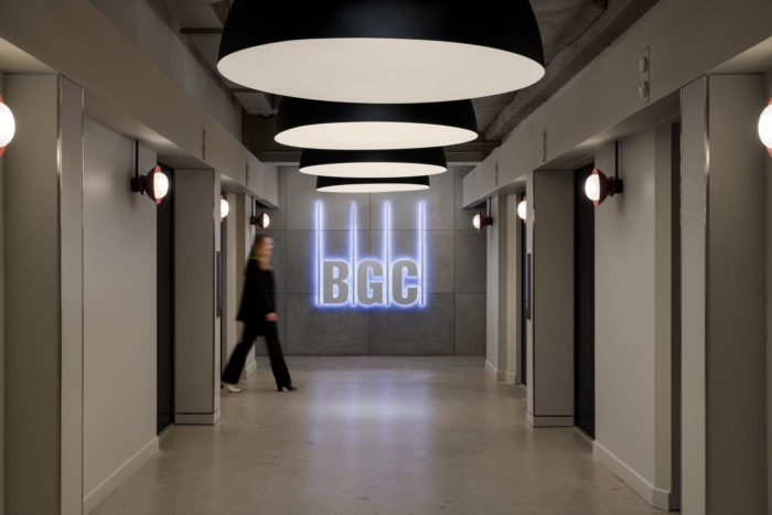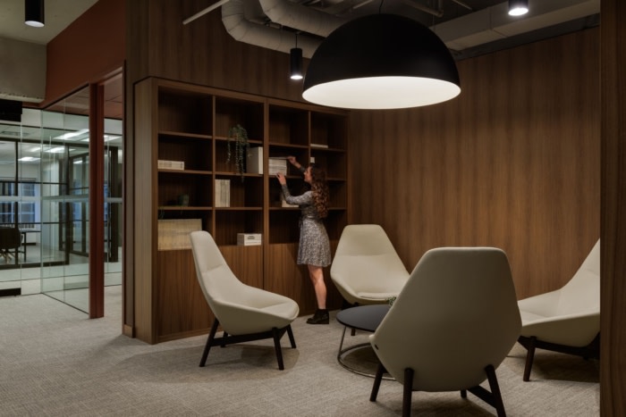 设计团队认识到相互连接的楼梯的罕见存在,这是卡尔加里市中心不常见的特征,因此抓住机会将其转变为一个独特的焦点。通过对现有面板进行修补和更换,保留了结构完整性,同时提升了设计,使其与整体修订后的美学保持一致。这不仅增添了一丝独特性,还保持了办公室不同楼层之间的联系。#办公室装修方案#