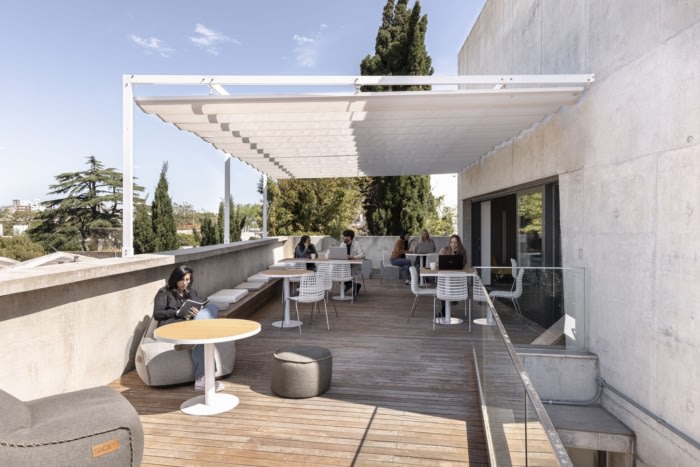 以前未使用的外部空间通过新家具和各种遮阳系统变得栩栩如生,因此员工现在可以与自然直接接触进行社交和工作。在整体美学方面,选择了以原色(红色、蓝色和黄色)为主的调色板,其色调与饰面、天花板和地毯相得益彰,与几何图形同步,为空间增添了活力和个性。#办公室室内装修公司#