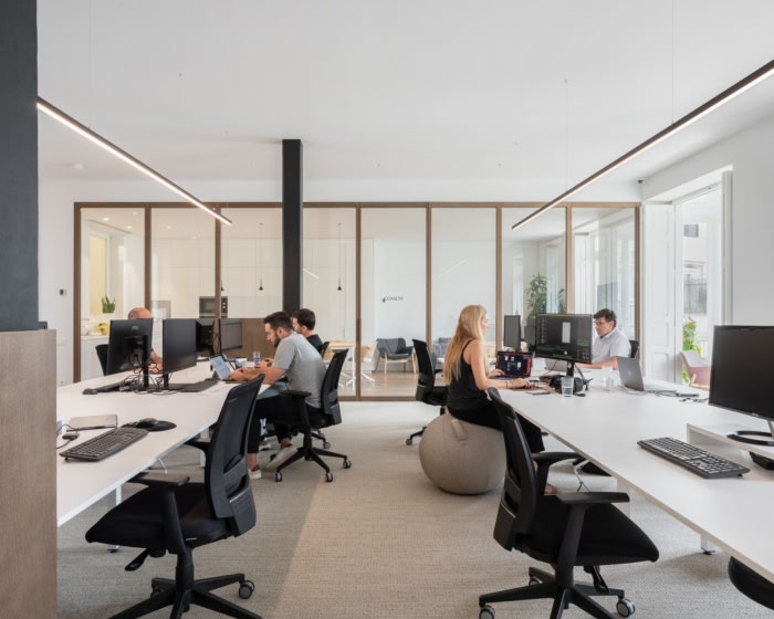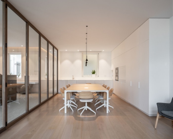 该项目提出了两个主要的工作空间。这些区域具有开放、敏捷和灵活的特点,没有等级制度,可以根据公司及其员工的日常活动使用。这种方法加强和促进了不同部门和部门之间的沟通。此外,这些主要空间周围是各种类型的会议室和焦点室,与公司的日?;疃嗟靡嬲?。该项目的最初目标之一是设计舒适健康的办公室,让人们可以像在家里一样感到轻松自在。#佛山办公室装修公司#