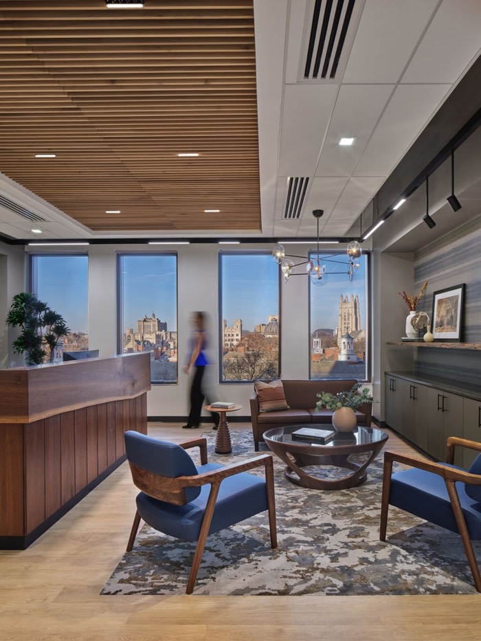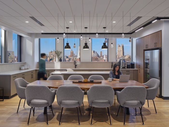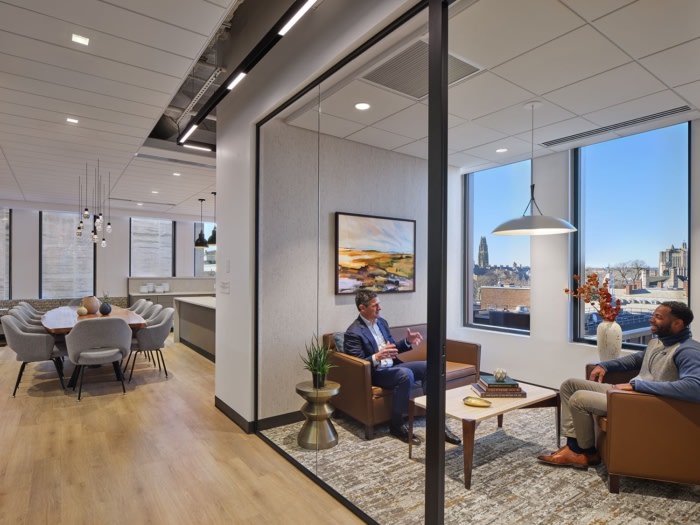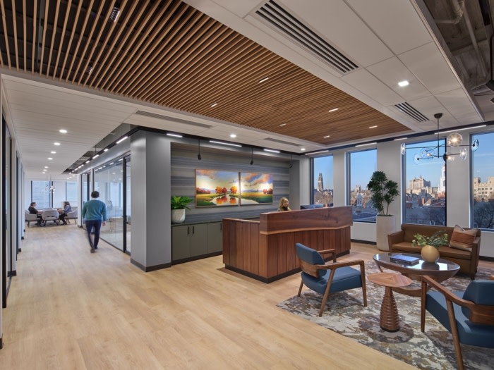 工作环境专为温馨而设计,呈现出丰富的质感饰面调色板,由大地色调和对比鲜明的木材组成,并由温暖的黄铜和深色金属点缀。这些以住宅为灵感的环境以温暖的装饰照明、区域地毯、精心策划的艺术品和装饰品为特色。新创建的工作场所的设计意图融合了专业的精致和温馨的舒适感,促进了客户的便利性,吸引了新的人才,并为员工提供了休闲互动的机会。#办公室室内装修#