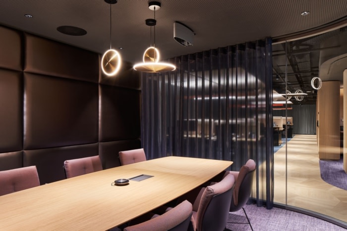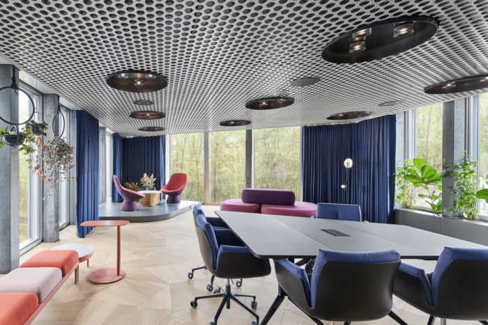 因此,通过增加小座位角落,将流通区域最小化,为原本死气沉沉的空间注入了真正的功能。设计的主旋律是圆角,它使会议室、众多的座位壁龛、视觉上独立的功能区或厨房柜台具有柔和的形状。办公室为非正式会议提供了各种区域,并在流动而精心设计的平面图上在开放和封闭区域之间交替使用。彩虹色金属墙板为位于内侧且日光较少的会议室增添了特殊效果和舒适感。#办公室装修设计公司#