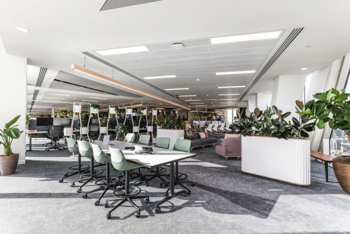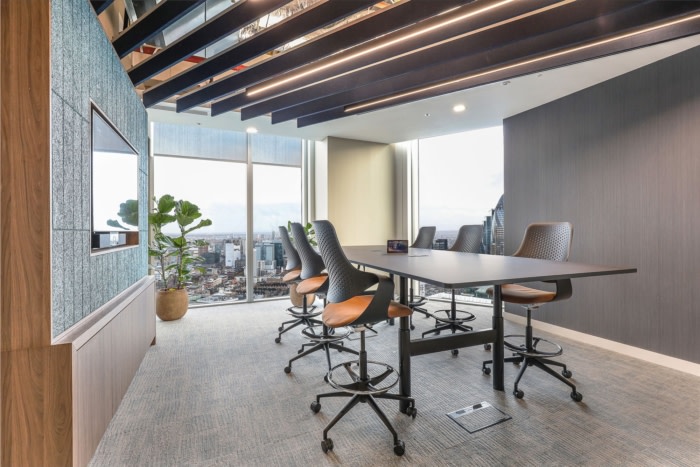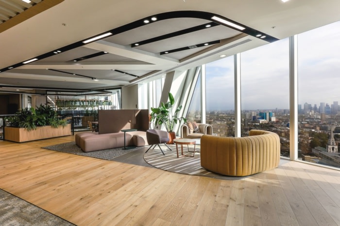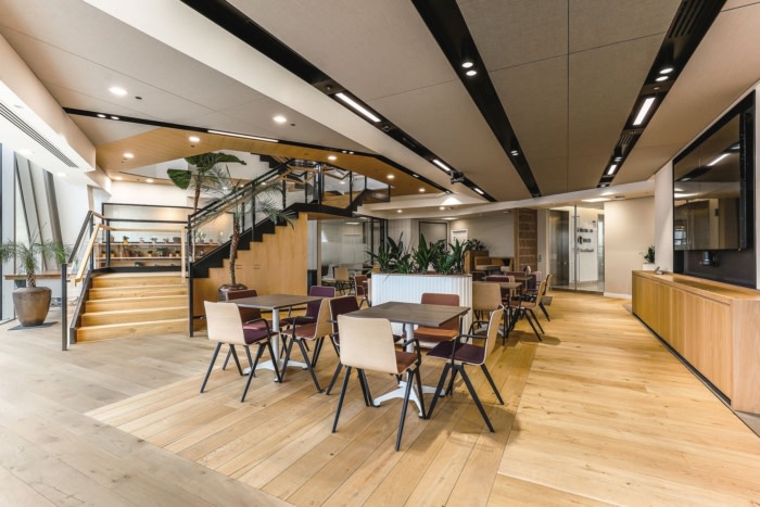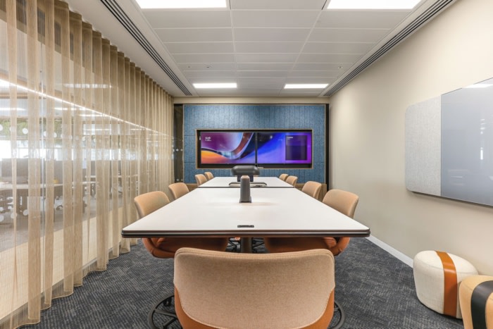 许多现有的地板也被保留了下来,除了需要添加新特色地毯的区域。由于天花板的保留,许多装饰性照明元素也被保留在原地,只要它们与方案的新筏子和线性特征很好地结合在一起。全新的元素包括办公桌区域上方的新龙门架,具有涟漪般的水质感,这个空间的灵感来自非洲五大湖的景观。#办公楼装修公司#