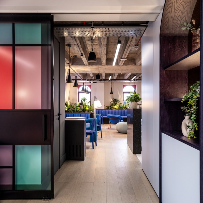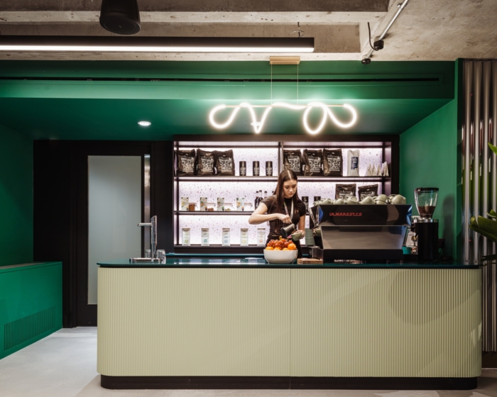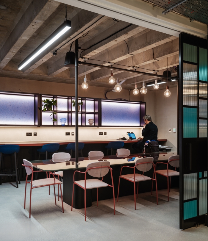 该设计适应了各种各样的工作模式,一楼和顶层没有办公桌,取而代之的是一系列专为协作和互动而设计的空间。在地面层,这些范围从传统的会议室到落地工作站和咖啡师站。上层以会员酒吧为蓝本,设有长椅和滑动隔板,从角落舒适到开放式屋顶露台,营造出不同程度的亲密感。#办公室装修设计#