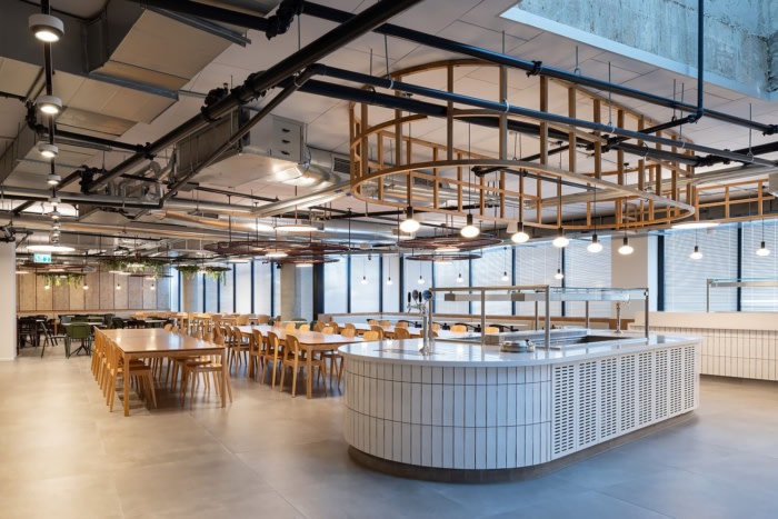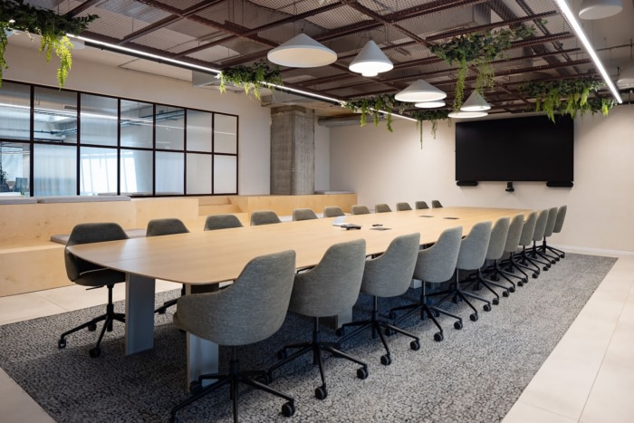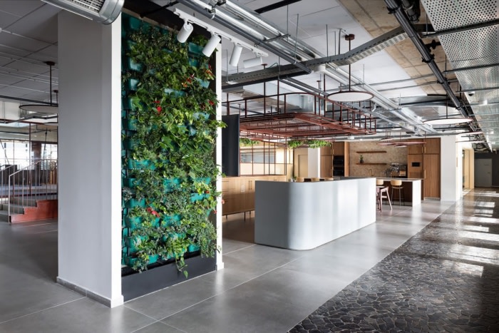 与典型的办公室美学不同,该设计旨在为公司的年轻员工营造一种温馨的氛围。石材、竹子、混凝土和木材等天然材料将室内和室外空间无缝融合,促进了从一种到另一种的和谐过渡。值得一提的是,九楼设有宽敞的商业厨房,所有餐点均由公司内部专业准备。天窗点缀在天花板上,引入自然光,并促进直接流通到宽敞的屋顶,从那里可以欣赏到特拉维夫和各种引人入胜的聚会区的全景。两个设计优雅的楼梯进一步增强了楼层之间的垂直连通性,促进了员工之间的流畅运动和互动。#办公室室内装修#