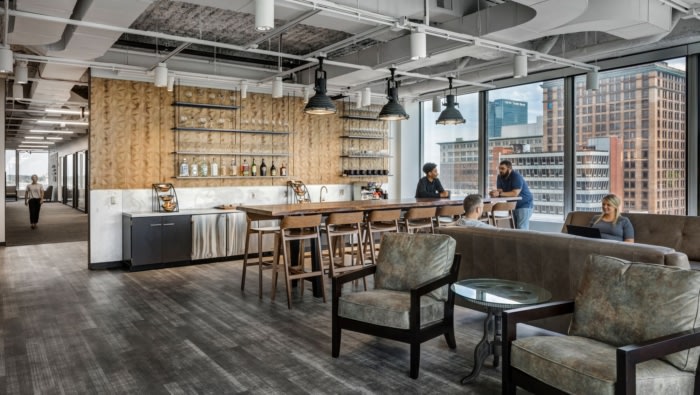 开放式楼梯既是物理连接,也是员工在楼层之间观察和交谈的机会。升高的楼梯平台既是整个办公室聚会的焦点,也是枢纽。#办公室设计装修#