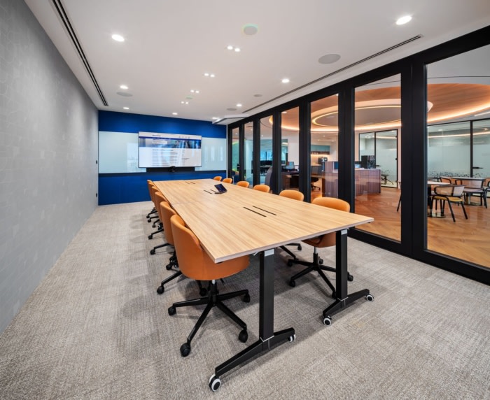 接待区被设想为一个以酒店为灵感的空间,让人联想到机场休息室,游客可以在预定的采访或会议之前放松身心。暖色调、自然采光和舒适的座椅选择相结合,旨在为客人创造一个温馨而平静的环境。该设计优先考虑适应性和灵活性,会议室配备了可操作的墙壁,以适应不同的团体规模和配置。这种灵活的方法延伸到家具的选择上,家具的设计可以很容易地重新配置,以适应空间不断变化的需求。#办公室装修设计公司#