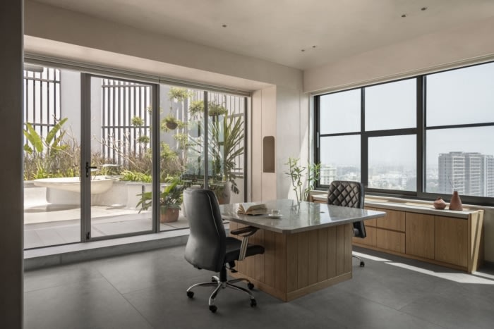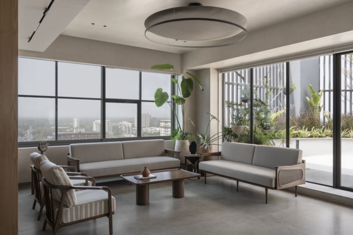 设计师向客户提出了一个简洁的私人工作空间,即符合Vaastu标准的私人工作空间,向客户反映出他们的个性,并散发着低调而精致的奢华气息,设计师专注于创造一个诚实的空间,采用中性温暖的色调和纹理,点缀着天然木材和绿色。当游客进入时,他们的视线被动态的 29 英尺雕塑光宣言作品引导到雕塑般的接待台之外的开放式露台阳台上,这是这部视觉交响乐的核心。#办公室装修公司#