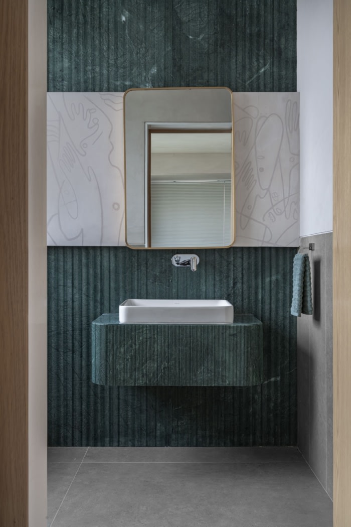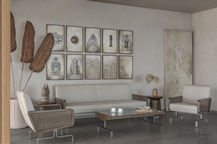 以柔和和朴实的色调向侘寂调色板致敬,在这里策划了一场感官交响乐——印度绿色大理石中较深的深绿色点缀;大量柔和的米色,如石灰抹灰墙和瓷砖地板;和棕色的家具,与软家具的奶油白色的柔和色调形成鲜明对比。#办公室装修公司哪家强#