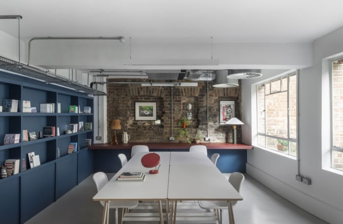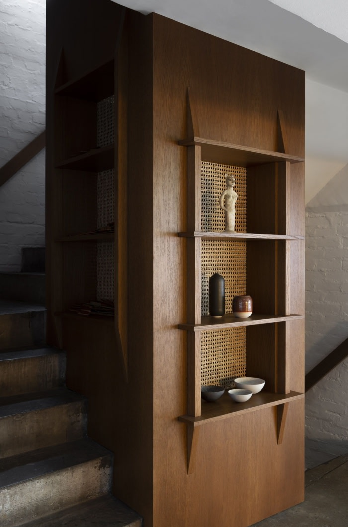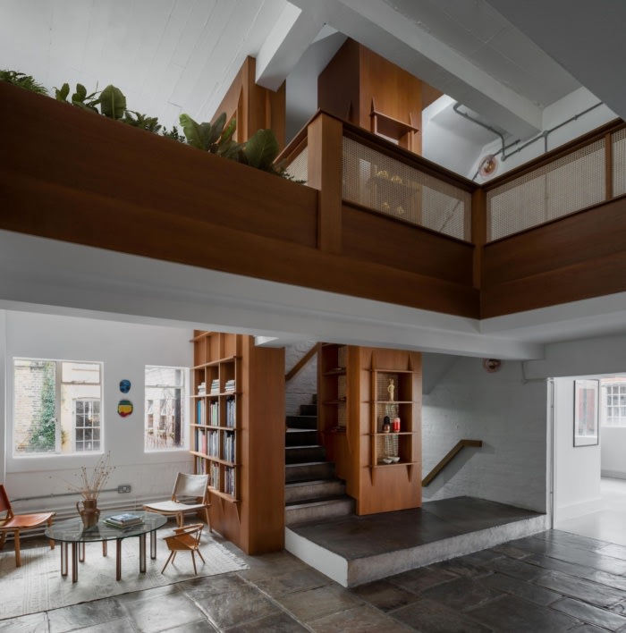 办公室位于一楼,工作区位于一楼和二楼。该方案的核心是一个标志性的木楼梯,该楼梯在两层楼之间上升,分隔了楼板并激活了周围的空间。它是工作室的核心,同事和客户可以聚集在这里工作或社交,交流想法和灵感。定制的木板包裹着原来的楼梯,提供多功能用途,如搁板、照明、座椅(包括阅读角落)和景观美化。这些面板的细节灵感来自丝绸织工的木材工具和织机机械,以及参考编织技术的藤条填充物。#办公楼设计装修公司#