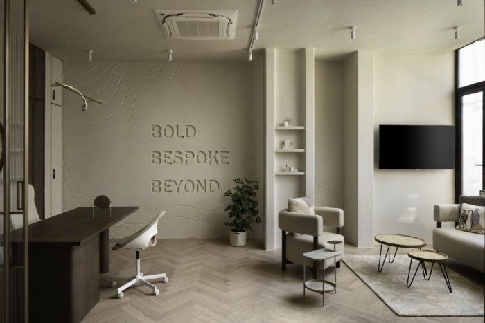 接待区为整个办公空间定下了基调,体现了企业的品牌形象。它弯曲的墙壁和柔软的边缘,与企业品牌的流畅线条相呼应,为游客营造出温馨的氛围。豆形入口标志的灵感来自企业的产品封面,该产品封面具有独特的豆形形状。这种设计元素作为品牌身份的视觉表示,并与产品本身建立了联系。#办公室室内装修公司#
