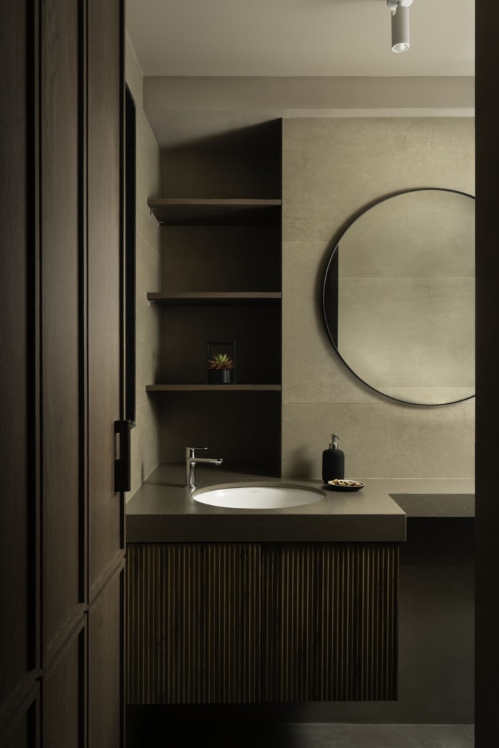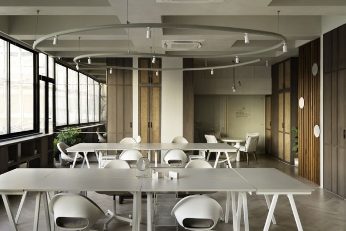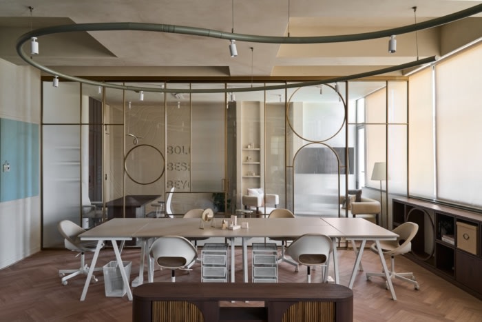 藤制百叶窗和自然纹理给人一种温暖和舒适的感觉,与贯穿整个办公室的人字形木地板相得益彰。定制设计的桌子配有石灰石膏腿和石材桌面,增添了一丝精致感。选择带有木腿的椅子与地板相匹配,营造出有凝聚力的外观。此外,还增加了一块玻璃板,以方便团队会议和讨论,使这个空间成为协作工作的多功能场所。#广州办公室室内装修公司#