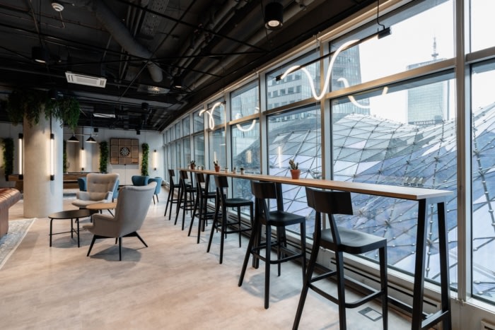 联合办公厅和会议室的设计风格相同、统一且一致。深色的天花板上点缀着动态排列的 LED 灯具。室内装饰由门、台面上的木材和墙壁装饰形式温暖。房间中间是各种柔软的座椅和咖啡馆风格的地毯,不容错过顶级的切斯特菲尔德沙发。该区域还提供98英寸电视和游戏机。从金色露台的圆顶望向,您还可以组织台球比赛,在街机上玩耍,并测试自己向目标投掷飞镖。#公司办公室装修方案#