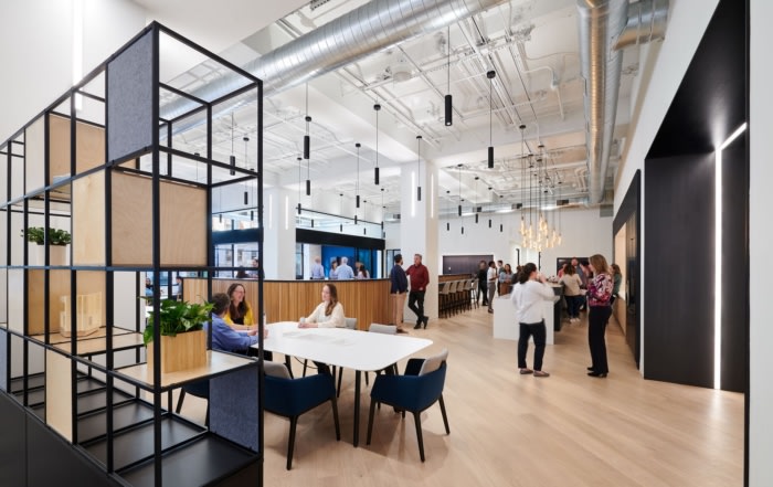 优雅而永恒的办公空间以温暖的木材、黑色金属以及海军蓝和李子色的色彩飞溅为特色。每位员工都有机会为新的混合办公室贡献设计理念。新办公室包括不同类型的工作站、协作空间、Zoom 房间、电话亭、小型会议室、设计实验室、饰面图书馆和其他专门设计的工作空间。办公室使用内部工位预订系统。#办公空间设计公司#