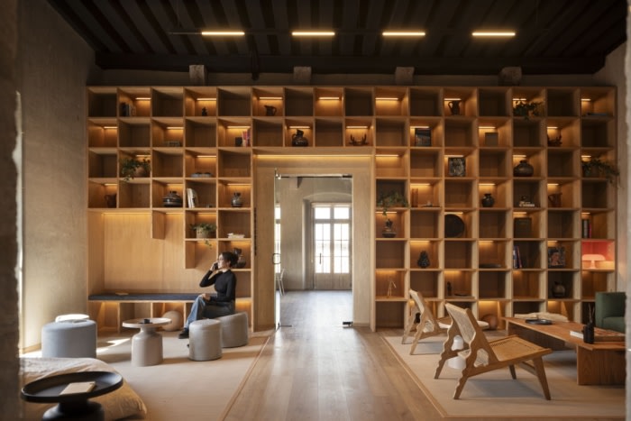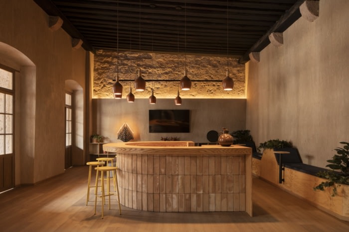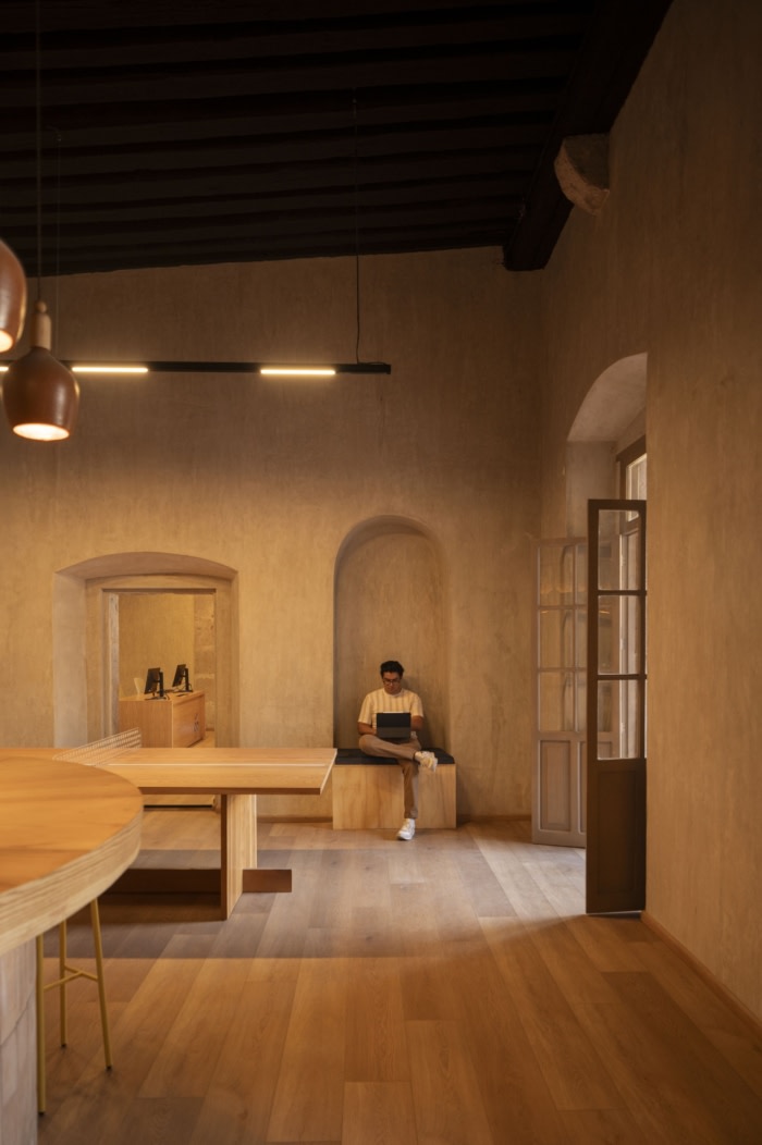 在材料选择方面,重点放在自然和区域性的饰面上,以维持项目内的温暖与和谐感,并支持当地工匠和商业。墙壁上装饰着沙色的石膏,营造出中性的背景,并点缀着树叶、家具和氛围等微妙的装饰。橡木,用天然漆完成,被突出地用于木制品,并辅以白橡木木板地板。此外,由米却肯州的工匠制作的粘土元素,如灯具、花盆和装饰品,都被深思熟虑地融入到设计中。#公司办公楼装修设计#