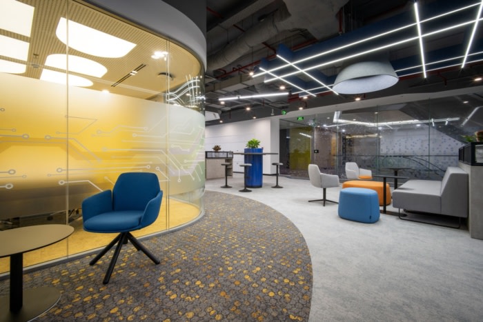 技术的生命力、演变和复杂性可以在办公空间中通过分区、照明和装饰来解释。设计强调品牌,注重从接待区开始的品牌认知度。通过钻石的棱角和闪光等特性表达出设计的灵活性,可以成为提供各种工作空间以适应不同工作方式的灵感。正如碳经历了一场变革之旅,成为一颗璀璨的宝石。#办公室设计装修公司#