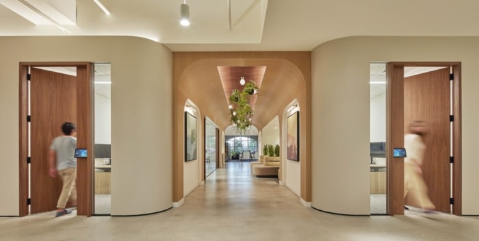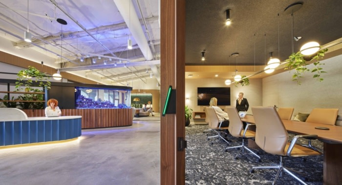 便利设施包括一个通向私人户外露台的中央咖啡厅、众多咖啡站和一个多功能休息室,白天提供图书馆氛围,晚上成为专业级品酒室,同时为集会、客户会议或视频游戏比赛和酒吧测验聚会采用了一流的演示技术。装饰风格以郁郁葱葱的景观和整个空间精心策划的艺术品为主,还有一个500加仑的咸水水族馆,在接待处迎接团队和游客。#厂房办公楼装修方案#