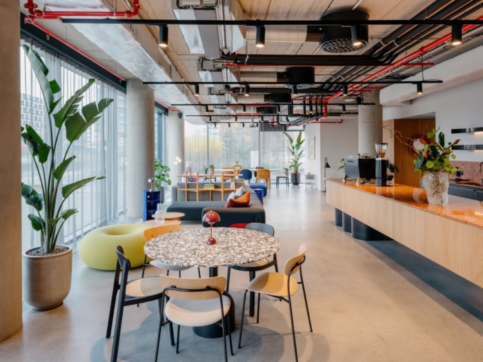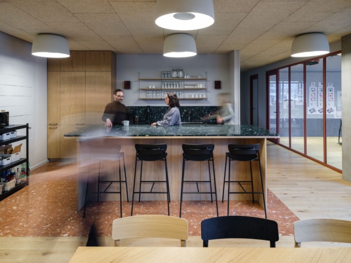 两个工作室的办公室都位于一楼。内饰以自然的调色板为主,辅以大胆的色彩点缀。工作室设有多个会议室、一个样品室、一个车间和一个模型室。然后,工作场所本身被划分为封闭空间和两个开放式开放空间,分别用于小型团队和两个开放式开放空间,分别用于室内设计、建筑和城市规划领域的团队。两间会议室可用于会议和头脑风暴:一间光线充足,配有玻璃角,而另一间则更深、更优雅,为专注的创意协作提供了更亲密的环境。#厂房办公楼设计装修公司#