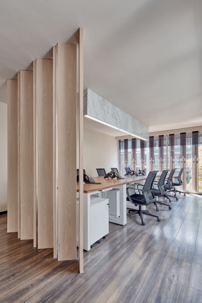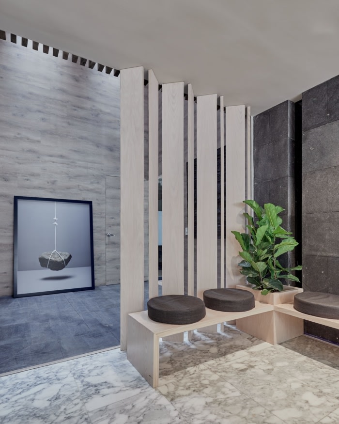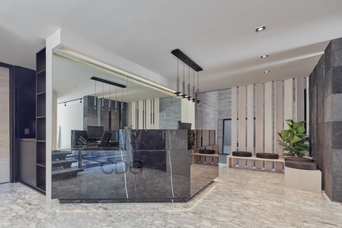 自然采光起着主导作用,通过战略性放置的窗户照亮两层楼,该窗户环绕着楼梯。东立面和西立面保留了落地窗开口,保留了原有建筑的完整性。从入口到接待处的整个旅程中,都安排了一系列自然元素,包括各种植被和一面水镜,水镜进入房子并在楼梯淌,顶部是公司策划的艺术品。接待处由黑色大理石和白色纹理制成,与房屋原始的白色大理石地板形成了视觉上的对比,并以覆盖着镜子的墙壁为高潮,营造出宽敞的感和优雅的审美,堪比律师事务所。在这些空间工作不仅可以提供地位,还可以产生抱负。#办公室室内装修#