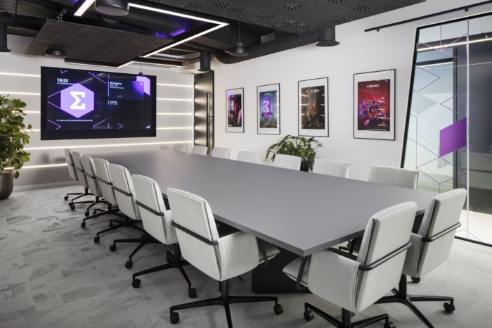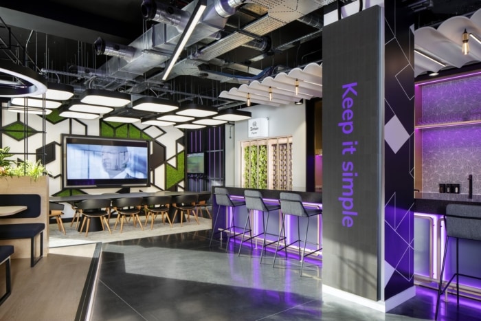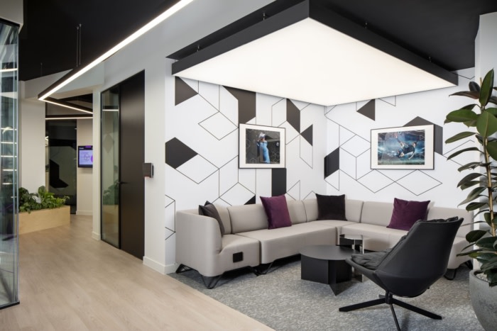 破碎的六角形是企业品牌的关键视觉元素,被内置于定制的照明、细木工制品和表现形式中,以鼓励运动。体育元素无缝融入设计中,包括被称为“龙门架”的独特细木工制品、用于观看体育赛事的专用屏幕以及通过“球员隧道”的入口。#办公楼设计装修方案#