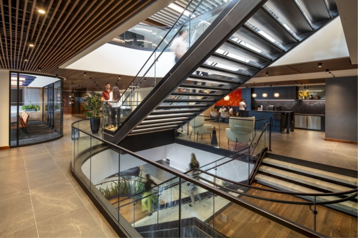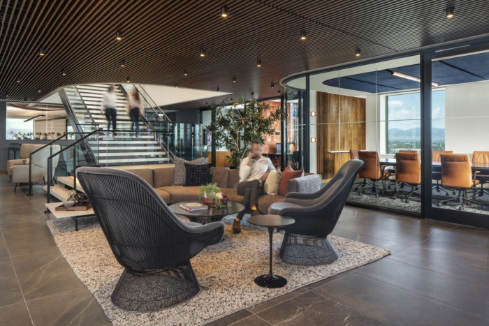 位于科罗拉多州丹佛市的泰伯中心大楼的前三层,客户要求我们解决楼层之间的连通性问题。将规划的楼梯延伸到另一个层次带来了技术挑战和中庭规范考虑。#办公楼装修设计#