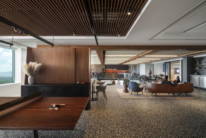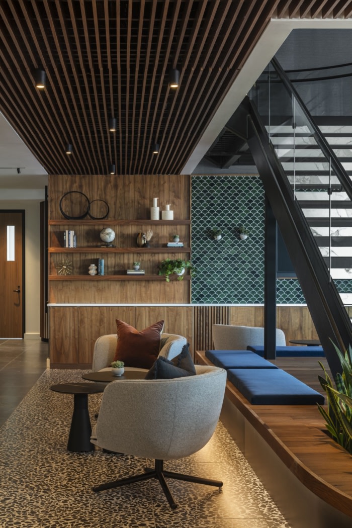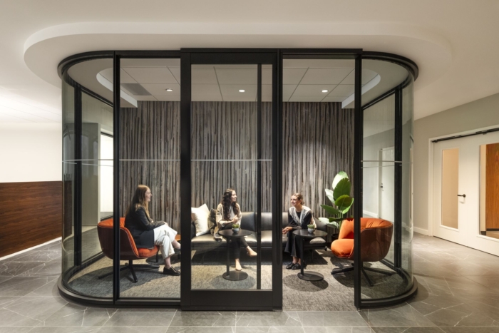 设计团队以复古、现代和一些严肃的乐趣作为回应。大量使用天然胡桃木和真石材,营造出经典的吸引力,而DIRTT的曲面玻璃技术则展示了现代制造能力。喜怒无常的灯光、烟熏玻璃和覆盖着瓷器的流通路径,这些通道在脚下咔嗒一声,营造出真正的专业体验。#办公楼装修设计公司#