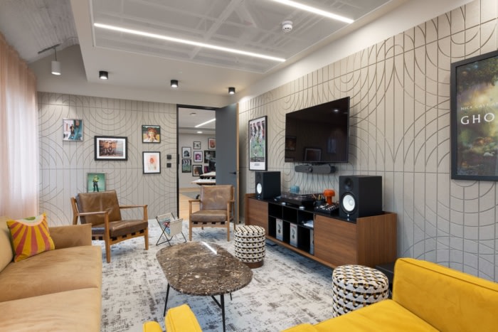 录音室是办公室的核心和灵魂,隔音墙将艺术家们置于一个充满创造力和尖端设备的世界中。温暖的色调和舒适的家具相融合,创造出舒适、协作和创意的空间,使人们能够创新和激发灵感。大楼电梯的中心位置在办公室中形成了一个分隔线,这给设计带来了独特的挑战。创新的解决方案是战略性地设计接待区,以弥合电梯入口两侧之间的空隙,和谐地连接两个空间。#办公楼设计装修方案#
