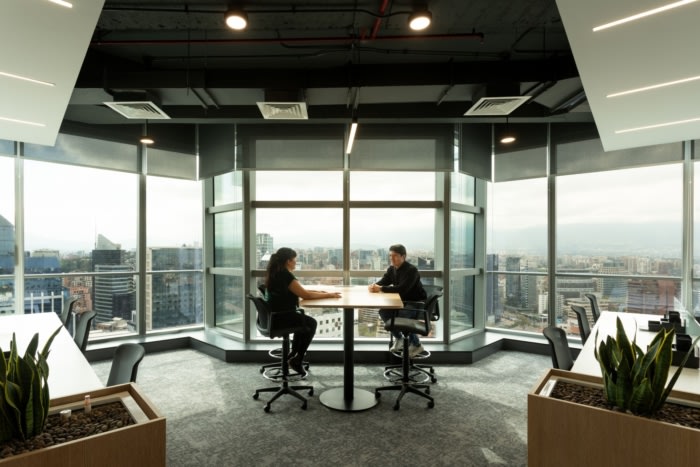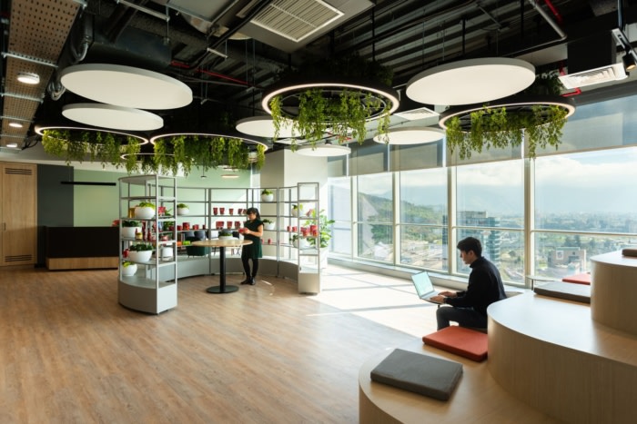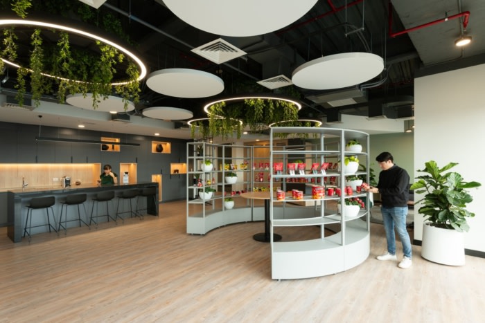 在分配给展厅的区域,也是办公室的主要入口,乡村概念非常明显。圆形在这里占主导地位,体现在玻璃展示品上——这是这个空间的主要吸引力——以及装饰着悬挂植物的灯具。展台和休息室,以及一个大厨房和一个品尝柜台,为这个展示中心提供了支持,这是客户和合作者社交活动的中心。#广州办公室装修公司#