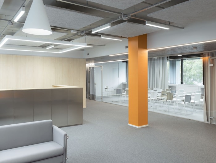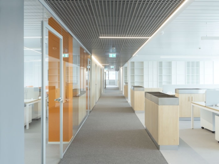 走廊和公共/休闲空间通过不同的地板颜色来区分,以指示特定的区域。天花板的设计也各不相同。照明项目遵循功能层次结构,利用“形状字母表”:工作站的线性照明,休闲区的圆形照明,公共聚会区的悬浮十字结构。相比之下,行政客房的设计更加家庭化,天花板上设有凹形照明。#办公室室内装修风格#