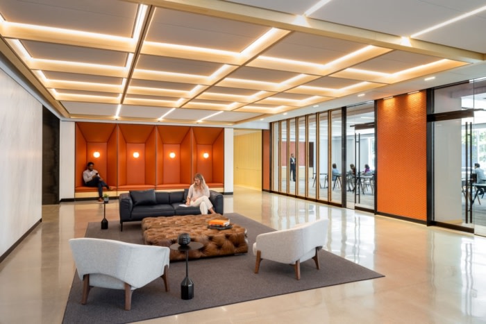 裸露的管道系统、雕塑般的照明和周到的体量突出了非凡的天花板高度并减轻了声学效果,同时在广阔的开放式办公室平面图中创造了亲密的小插图?;炷恋匕逖刈胖鼙哐由斓剿饺税旃?,玻璃过渡门允许阳光进入建筑的核心。#办公楼装修风格#