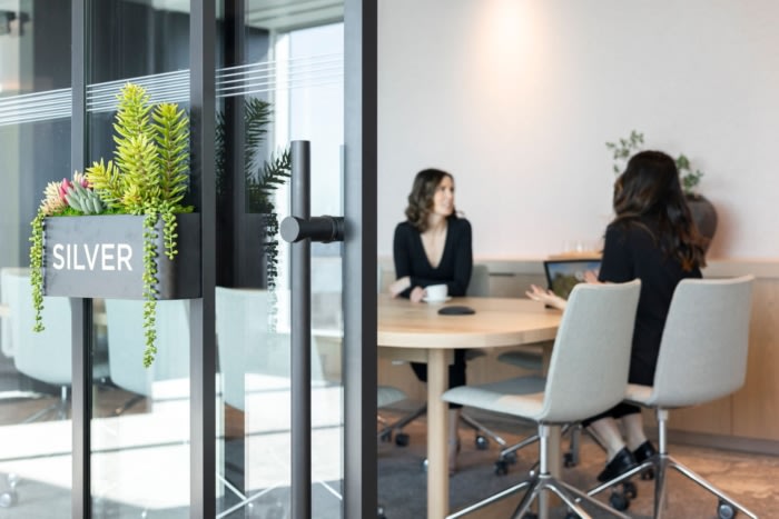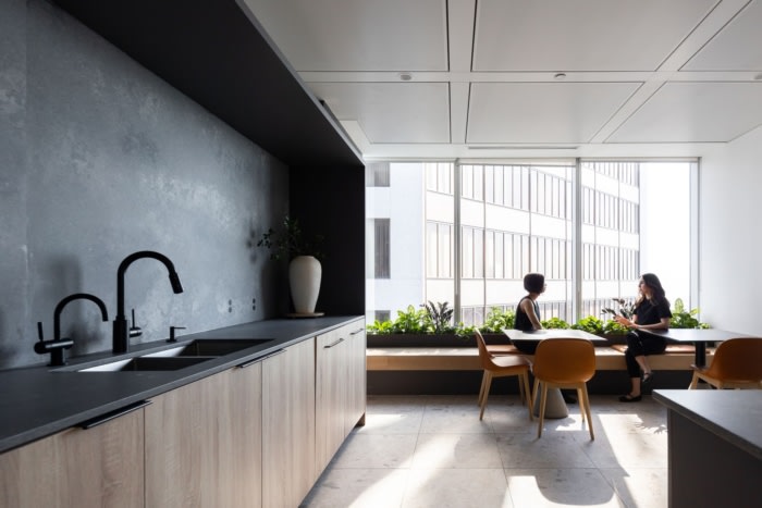构成空间的非传统材料包括夯土墙和注入沙子的石膏,描绘了世界的地形轮廓。接待区以抽象的手工刮擦石膏墙为特色,而从当地采石场开采的不列颠哥伦比亚省原生木材和花岗岩底座则被用于制作整个空间的所有会议室桌子。#知名办公楼设计装修公司#