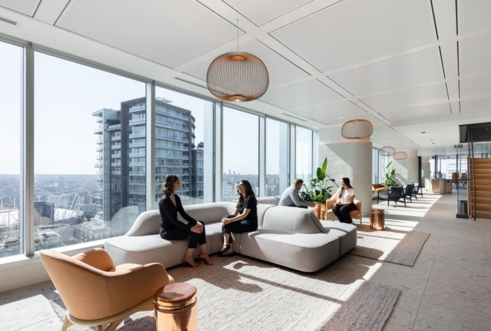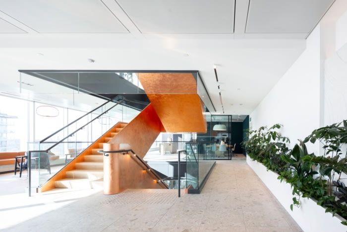 楼梯是一个结构和建筑奇迹,有弯曲的玻璃栏杆、BC 木踏板和铜质装饰??悸堑?33 个航班被吊到一栋有人居住的办公楼中的金属数量,仅物流就是一个奇迹。每层楼都以艺术方式展示的岩石和矿物样本、地质物品和历史悠久的采矿工具为特色。定制的花箱和植物代表了每个会议室的入口,巧妙地刻有元素周期表中的元素,再次加强了与采矿业的联系。#办公楼设计装修公司#