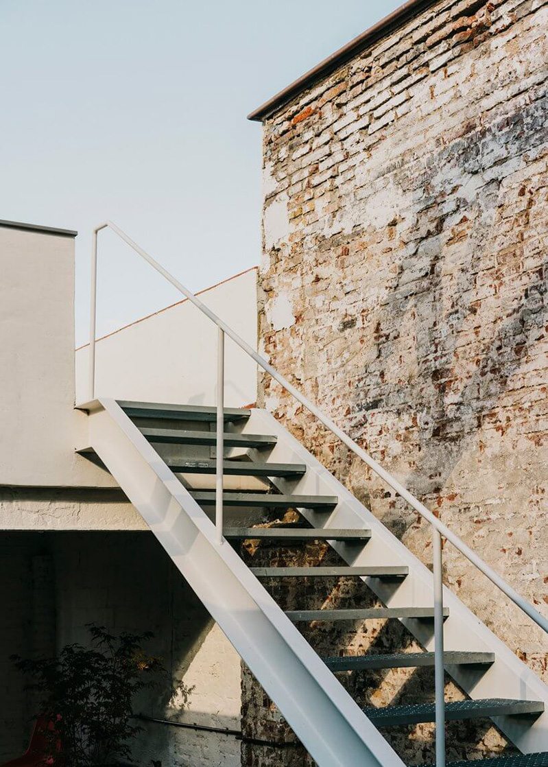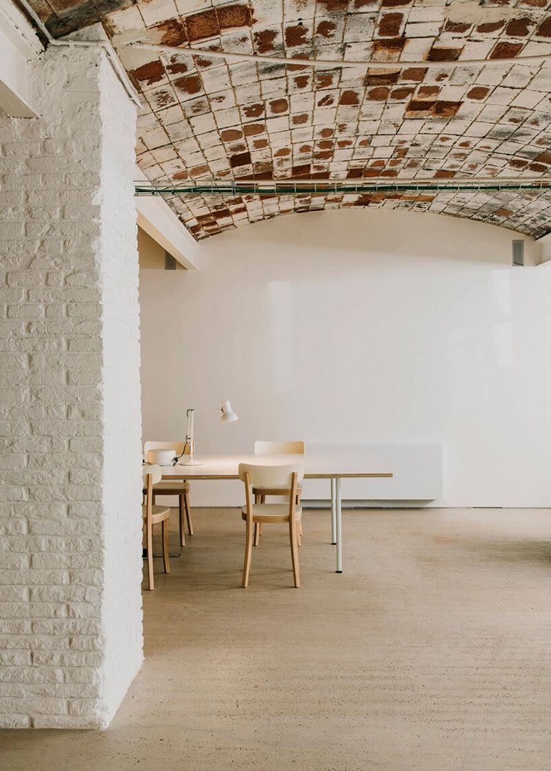 仓库有着绝对的层高优势,所以显得空间特别大,设计师将墙面进行了许多留白的处理,并没有过度的利用这些空间,表现出来最直观的感觉,是一种简单,却丝毫不简单。他们选择保留并利用建筑本身的原始材料,建筑材料表面粗糙的纹理及墙壁上的油漆碎片与当代家具和灯具款式进行搭配,裸露砖拱顶和原始的木材椽结合,办公室里有新的元素融入,也有旧的痕迹留存。