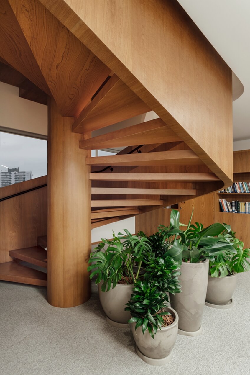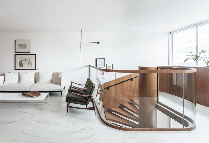 有机形式的灵感把直角变成了动态的形式,有利于运动的流动性。楼梯设计得像个雕塑,反映了重量和轻盈之间的平衡张力。木制品体现了元素之间的连续性,并与白色背景形成鲜明对比。