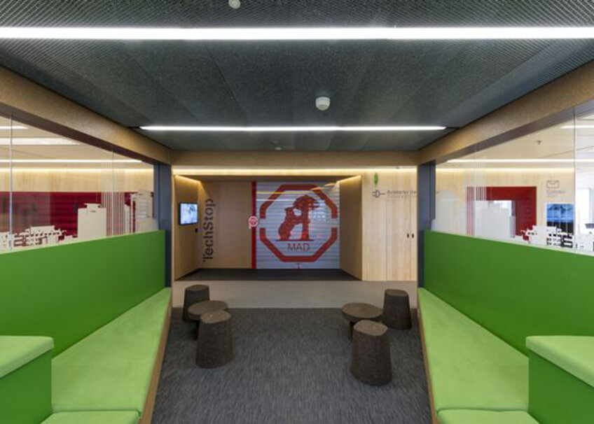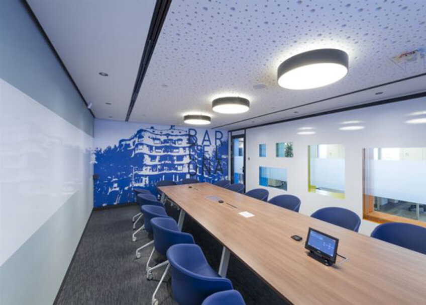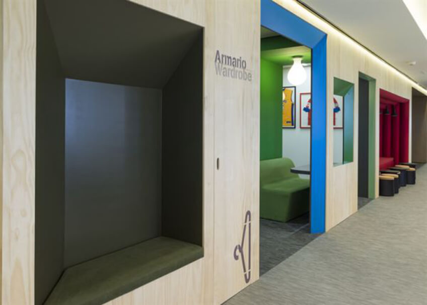 将传统的西班牙元素与该公司其他办公室的具体细节结合起来,上层是木材拱门,类似于西班牙传统建筑中的拱门,将工作区与会议室和隔间隔开。当然,办公室也有一个娱乐区。同一层,你可以找到非正式的展示区,按摩室和吊床区。