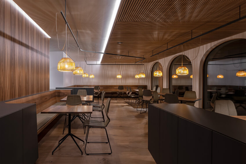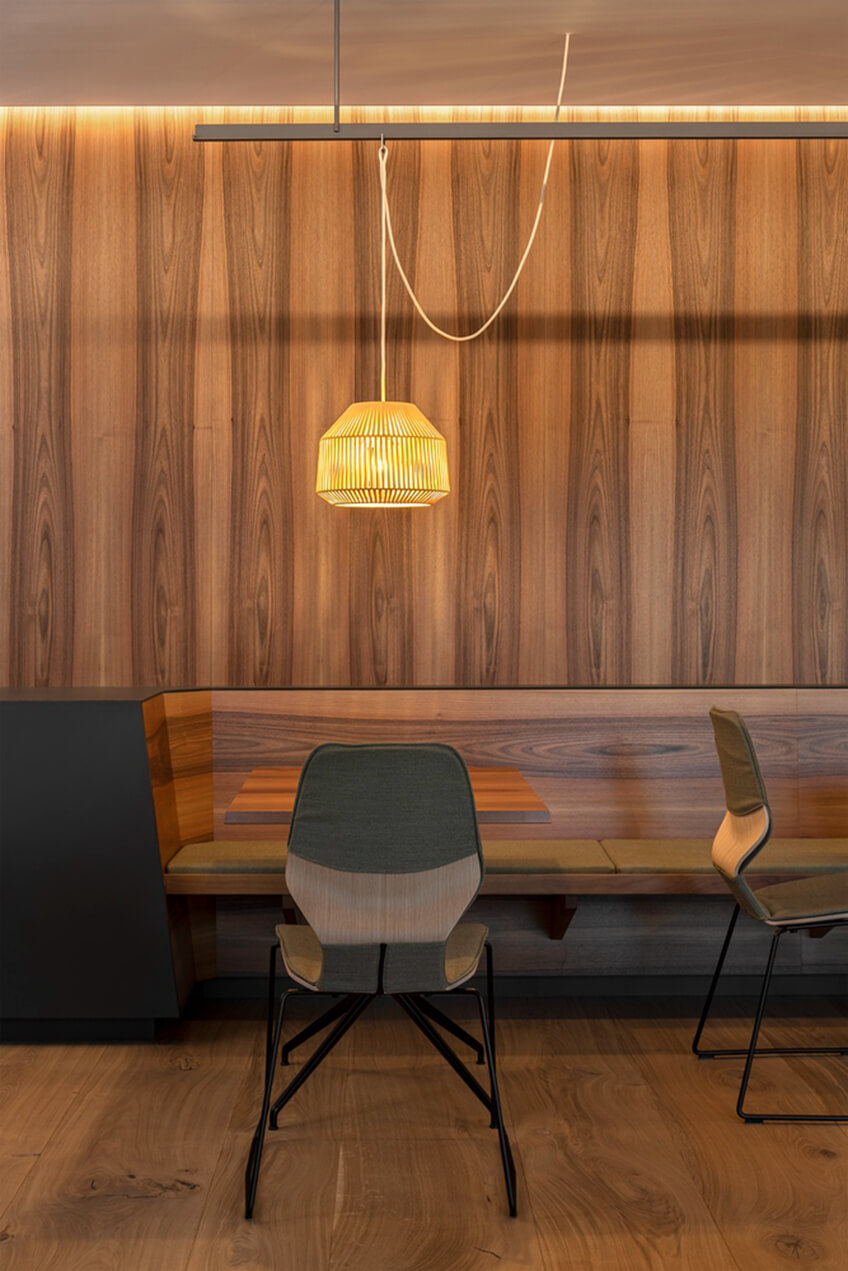 南部地区的深色家具漂浮在木地板上,内部温暖,让人流连忘返。在餐厅区域,灯光点的位置可以通过天花板上的栏杆变化而变化。