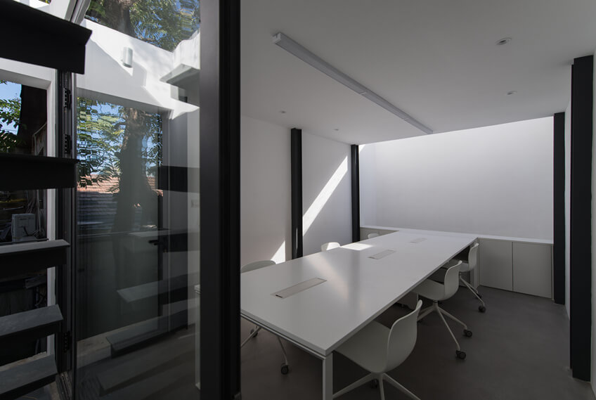 空间探索从四合院的原型开始,四面封闭的庭院。由于场地受到限制,这座办公空间设计四面封闭,在围墙内部空间通过庭院向大自然开放。在空间的约束下,中央庭院被压缩成一侧的露台。这种带有狭长庭院的封闭空间是中国本土建筑中典型的代表,封闭的围墙提供了隐私,向自然开放。