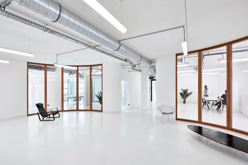 以工匠旅馆为目的,为了在设计中体现出这种精神。设计师们创造极简和实用型的办公室装修空间,将高质量与严格的标准联系在一起,对细节进行精细的处理和整理。让他们与材料做了精确的工作,特别是设计了弧形玻璃隔墙,形成了月牙形状的平面图,还通过突出创建过程中各个阶段增强了工作室空间的功能。