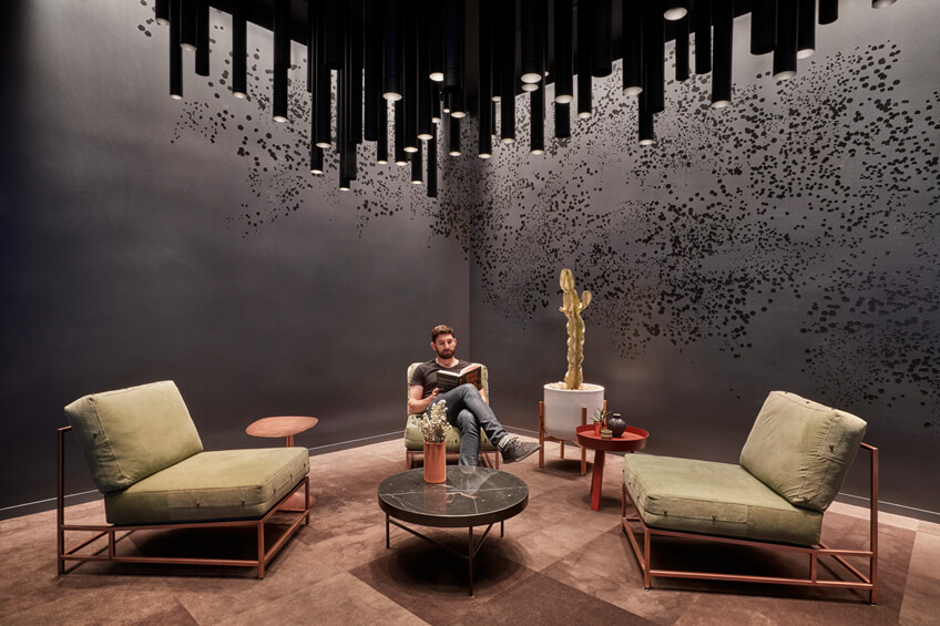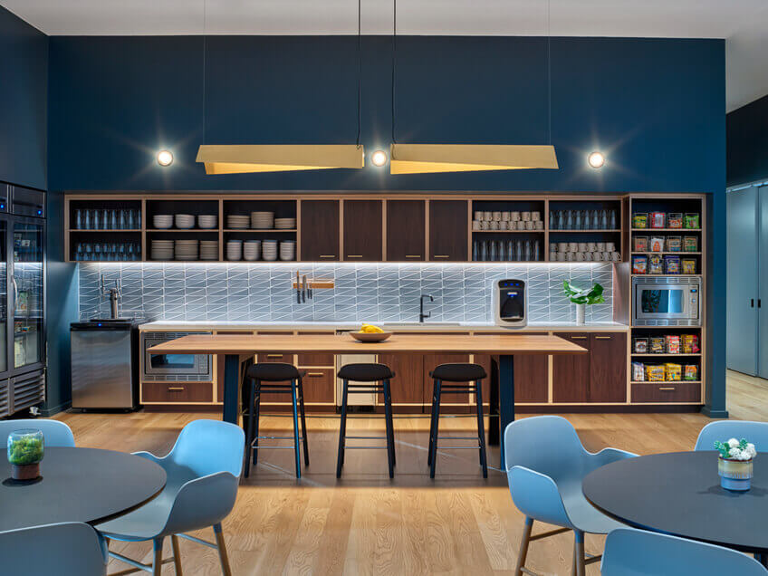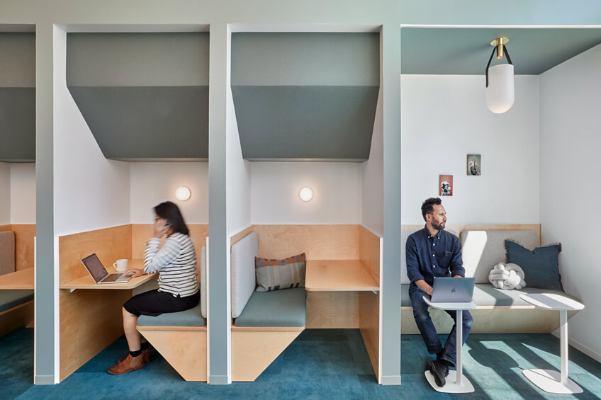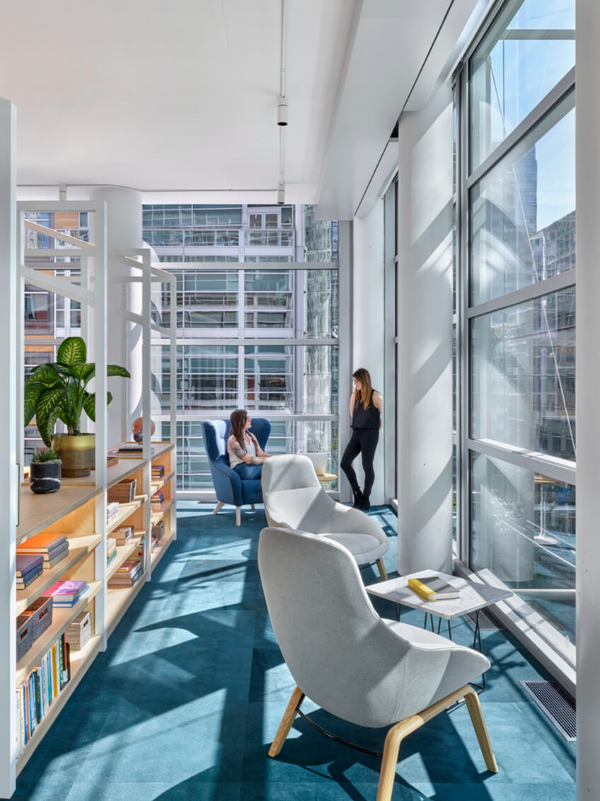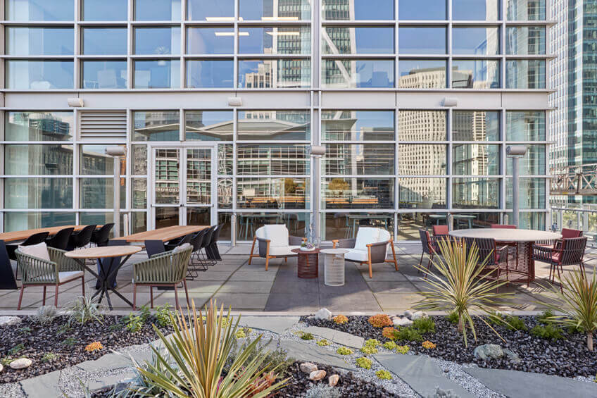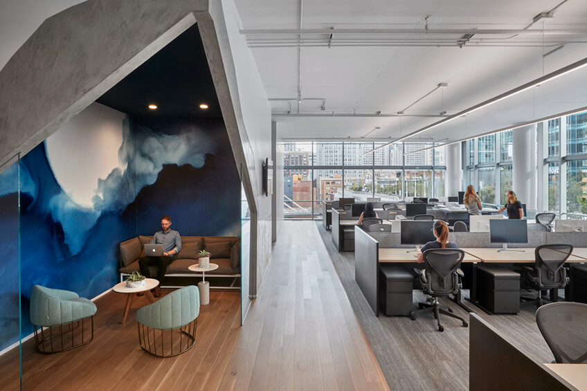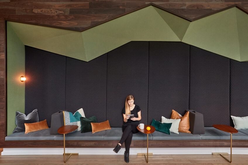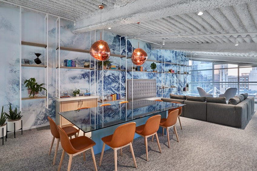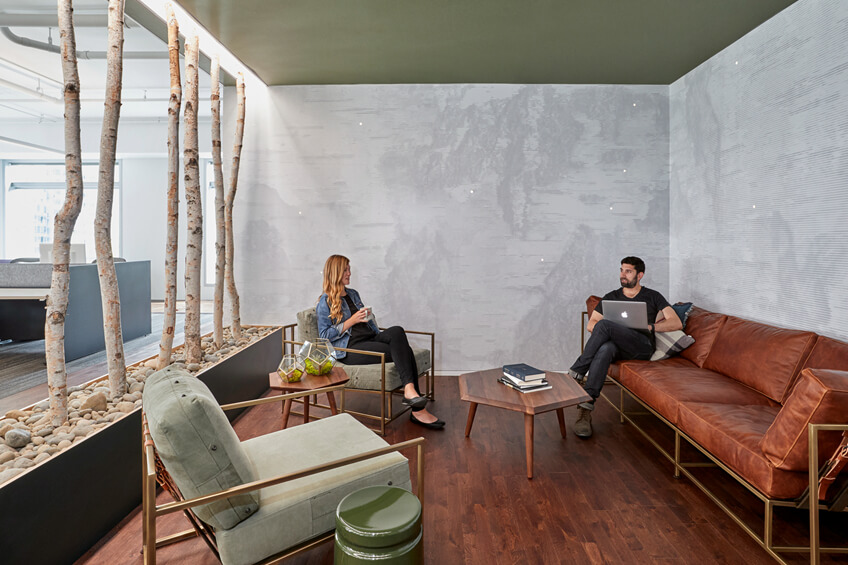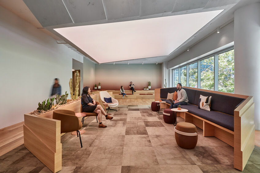 由办公空间设计为其讲解该O+A概念是创建一层接一层的景观,实际上是将电梯向上的旅程变成了从巴哈到太平洋西北的虚拟旅程。