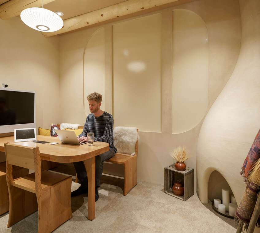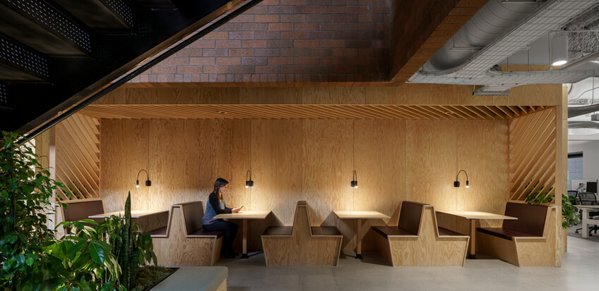 设计采用杉木胶合板和活植物作为主要的设计材料,整个办公室,软化硬边,并带来一些户外内部景色。为了创造惊喜和奇迹,把绿色植物放在意想不到的地方,包括屋顶,柜子,甚至桌子里。