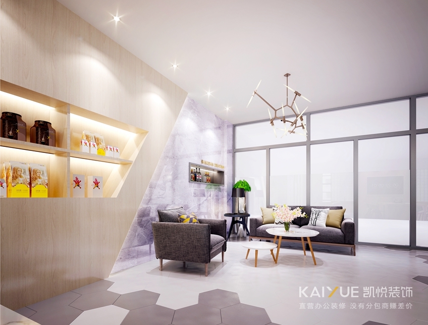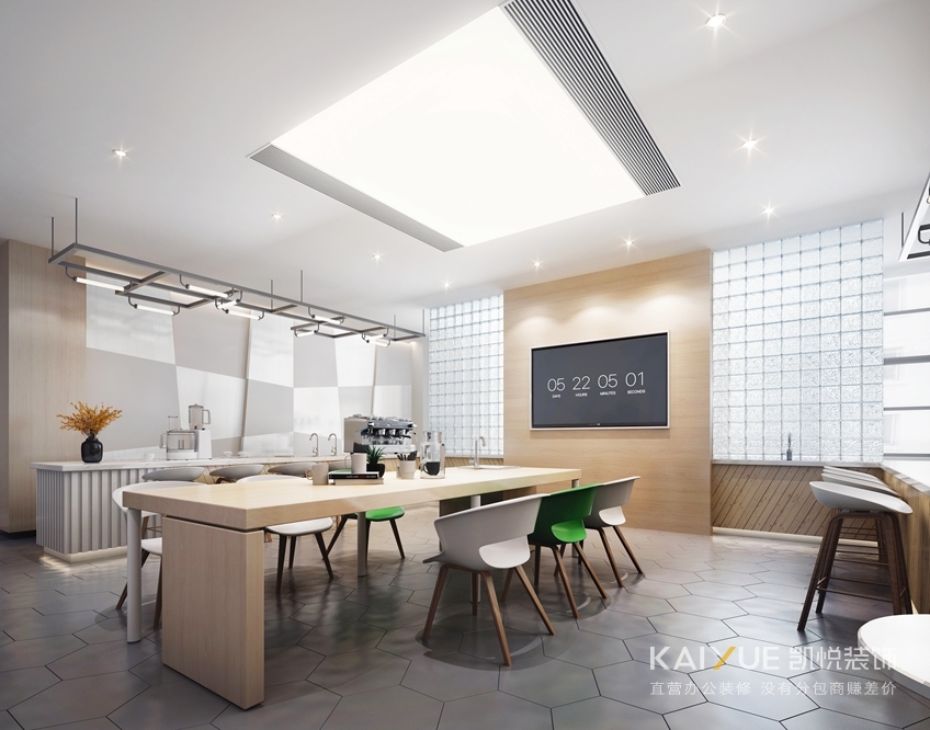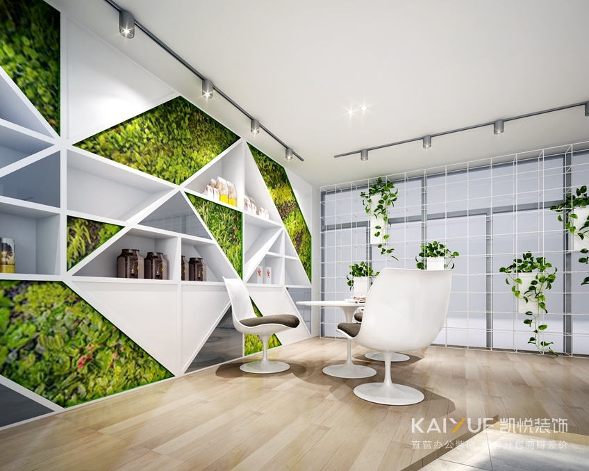 方案2:这一套方案细节更精彩一些,常见的咖啡屋偏工业风,设计师希望这个咖啡屋办公室拥有自己的个性,并没有选择工业风格。绿植的点缀,色彩的优雅,还有拼块造型的时尚,简约的气质里又加入了几分活力。