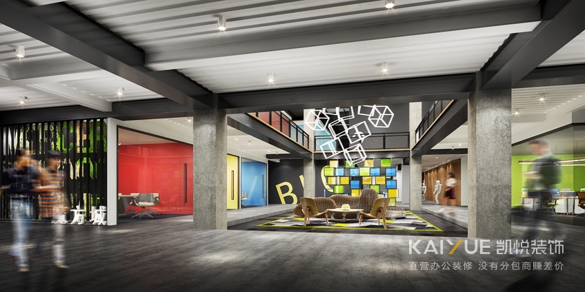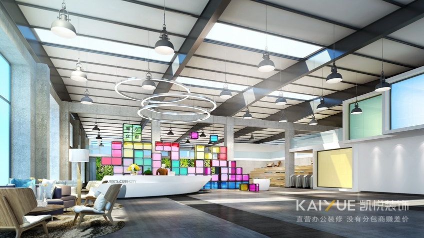 关于这种孵化中心、众创空间、文化创意园系列的办公室装修,有不少旧厂房改造的,选择经典的LOFT工业风,打造一个集生活、工作、休闲、娱乐为一体的年轻人的乌托邦。魔方作为世界上最知名的烧脑玩具,历经40多年变迁,已然成为一个流行符号、一种极客标志。无数设计师从魔方中获得立体几何、色彩光影、结构律动的灵感,文化创意园设计装修元素分析以“魔方”作为设计灵感,结合90s文化、极客文化串联整个创意空间打造前沿的信号区,创造性的办公理念!聚集年轻、活力、开放、创新的创客浪潮。以“魔方”为设计主题,定位为几何抽象的空间场所,力图运用简单的几何造型元素,简化内外空间结构,递减组合构造形式以及巧妙灵活的材质搭配,对原有建筑群体重新进行空间组织,突出空间的体积感和空间整体层次。