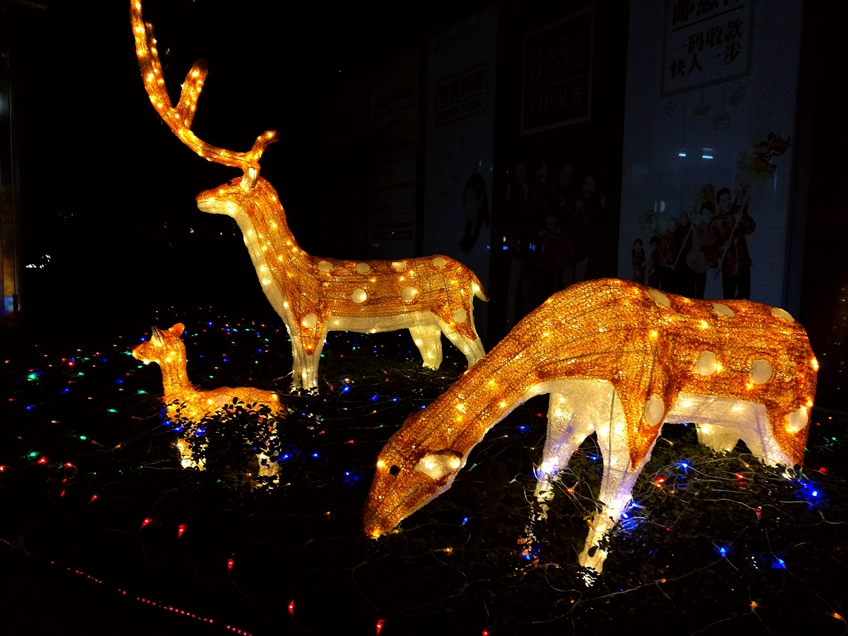 这些装饰在节日之前已布置好,大大小小的圣诞树、圣诞老人、雪娃娃、圣诞球,节日氛围非常浓郁,就像......就像圣诞老人掉进森林里,森林公主悄悄为他点了一盏星灯。