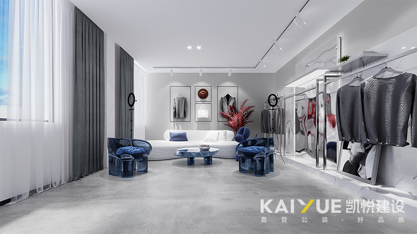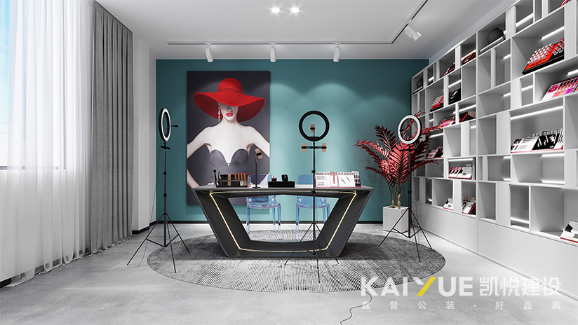 其直播间设计装修中主要运用几何线条作为元素,呼应建筑原有的特色结构。前厅与办公空间是不同性质的空间,在空间与空间的过渡中,稍稍改变通道的方向,能给整体空间增加节奏感,让人在空间的过程中有不同的感受。直播室通过不同的软装搭配,营造不同的空间场景。