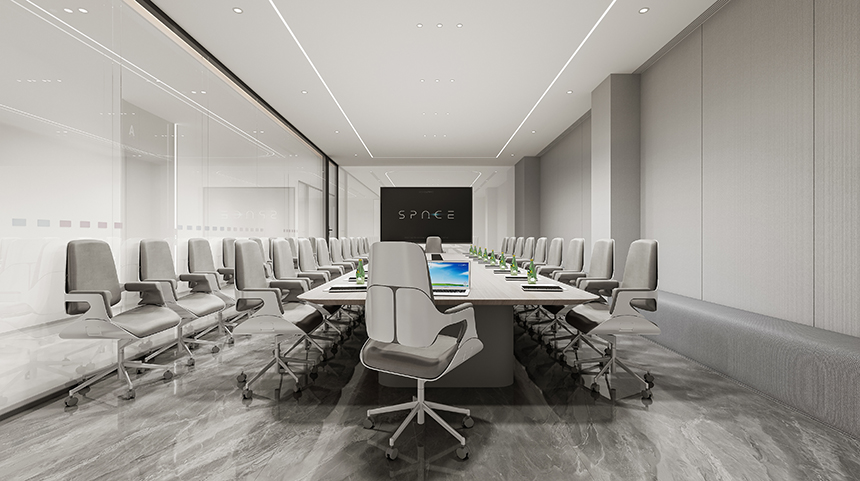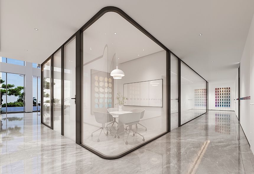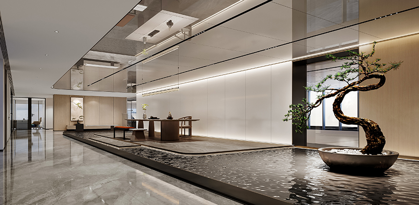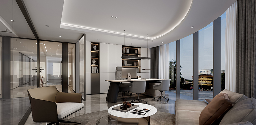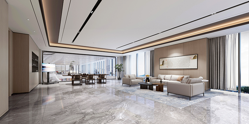 本案设计的白色亮光人造石大堂背景墙在光照下熠熠生辉,成为视觉焦点,彰显出高雅与纯净。木纹和咖色碳晶板墙体饰面巧妙融合,既保留了自然的温馨质感,又增添了现代都市的时尚气息。定制的玻璃旋转楼梯扶手,晶莹剔透,既安全稳固又充满艺术美感。整个办公楼大堂精致简洁而又不失大气,营造出一种高端商务的氛围。#办公楼装修方案#