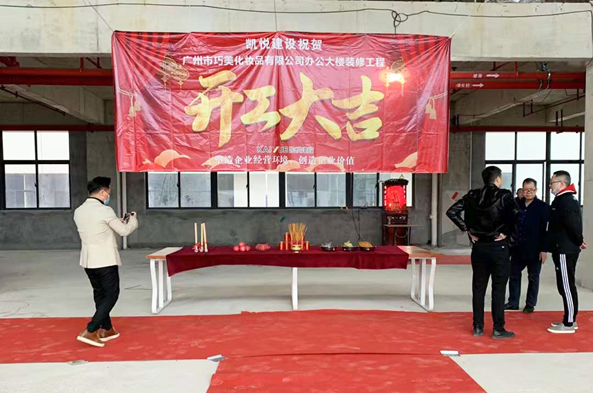喜讯丨广州市巧美化妆品有限公司新总部办公楼装修项目开工大吉 日期:2022-2-14 14:40:04 人气:1248 广州市巧美化妆品有限公司新总部办公大楼位于广州市白云区,办公楼装修面积约8000平方米,设计装修项目由凯悦建设承建。2月13日,良辰吉日,开工仪式在现场举行,一个能实现商务便捷,稳重可信、传承文化、充满希望的办公空间即将呈现。(开工仪式)(部分办公空间效果图) 上一篇: 祝贺丨广州信维电子科技股份有限公司办公室装修项目开工大吉 下一篇: 元宵团圆快乐丨一年初望明月照,汤圆滚烫闹元宵