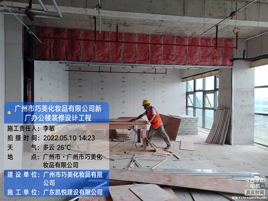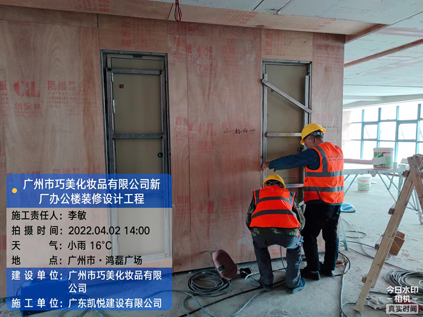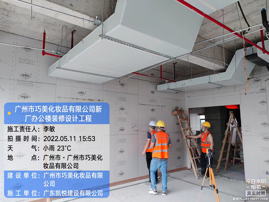 广州市巧美化妆品有限公司新总部办公大楼位于广州市白云区,现又增办公室装修项目,面积约1200平方米,设计装修项目由凯悦建设承建。