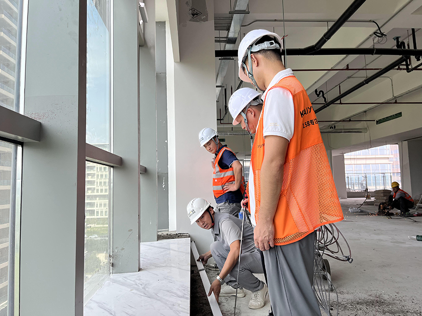 近日,公司工程主管部门组织了一次突击巡检活动,深入中山办公楼装修工地现场。本次突击巡检旨在通过全面、细致的现场检查与监督,确保装修项目达到高标准、严要求的施工品质,为业主打造一个安全、舒适、放心的办公环境。此次巡检由工程总监带队,依次对天花、地面、立面、弱电点位、瓷砖、洗手间防水等工艺细节进行检查,发现问题解决问题,做好每一个项目。#办公楼装修公司#