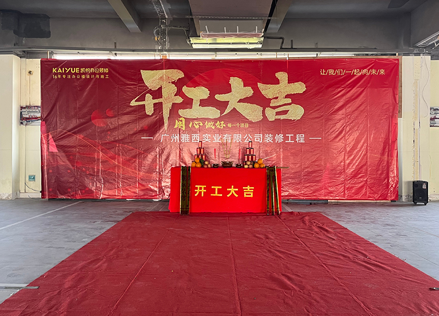 喜讯丨雅西实业3000㎡办公楼开工大吉 日期:2024-12-11 16:07:11 人气:1032 广州雅西实业有限公司办公楼位于花都,办公楼装修项目由凯悦装饰承接,项目面积约3000㎡,择一良辰吉日,举行了开工仪式,祝贺雅西实业办公楼装修项目顺顺利利,感谢客户选择,我们将不负重托,做好项目。 上一篇: 感谢肯定丨斯柯电器办公楼装修项目完工交付 下一篇: 为什么1000㎡以上的办公楼装修,热衷找凯悦装饰?