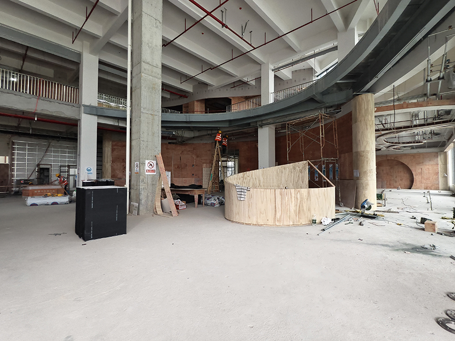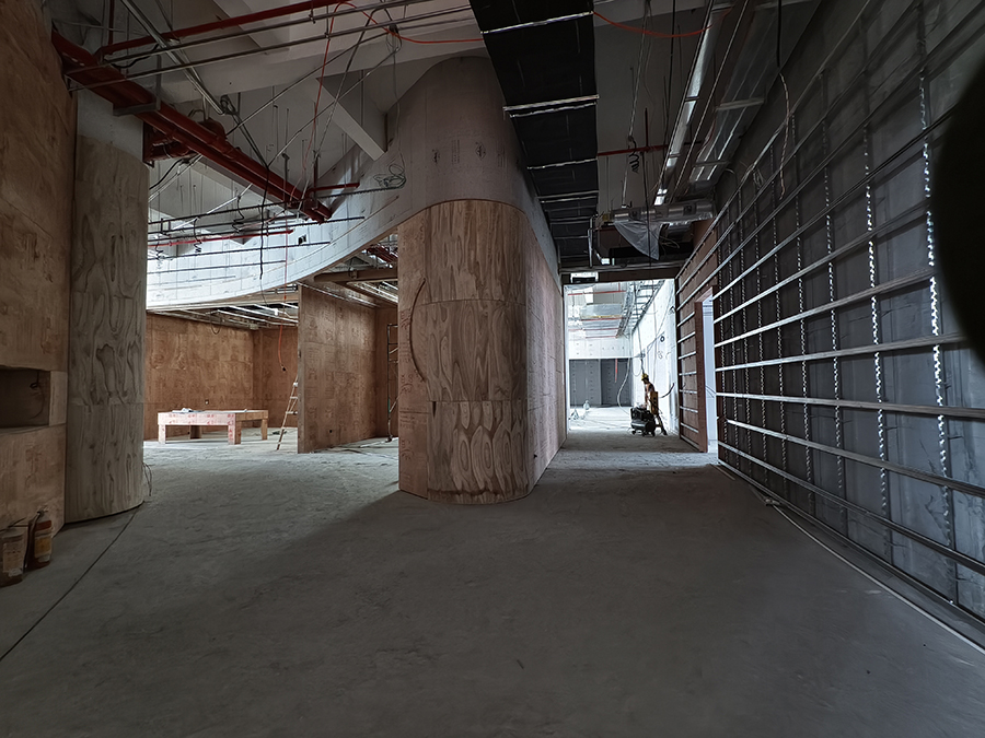大堂区域已完成钢结构加固、墙面基层处理及天花造型骨架搭建,空间轮廓清晰可见。消防、空调等隐蔽工程均通过验收,为后续装饰施工奠定基础。接下来是饰面板安装、地砖铺贴等进场施工。
